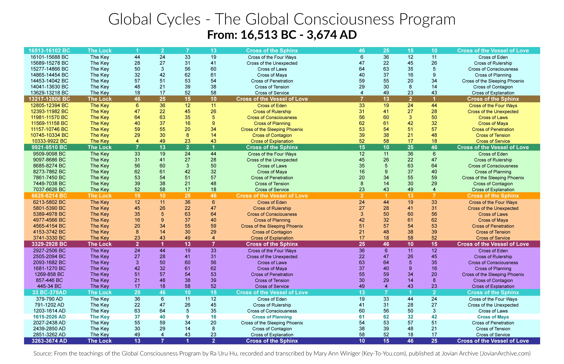 According to Rave Cosmology, there are 48 Global Cycles in a Round of 19,776 years. Our present Round began in 16,101 BCE and will close in 3675 CE. One Round is made up of six Epochs. The present Epoch began in 379 CE. Each Epoch is made up of eight Cycles. Our present Global Cycle began in 1615 and will end in 2027.