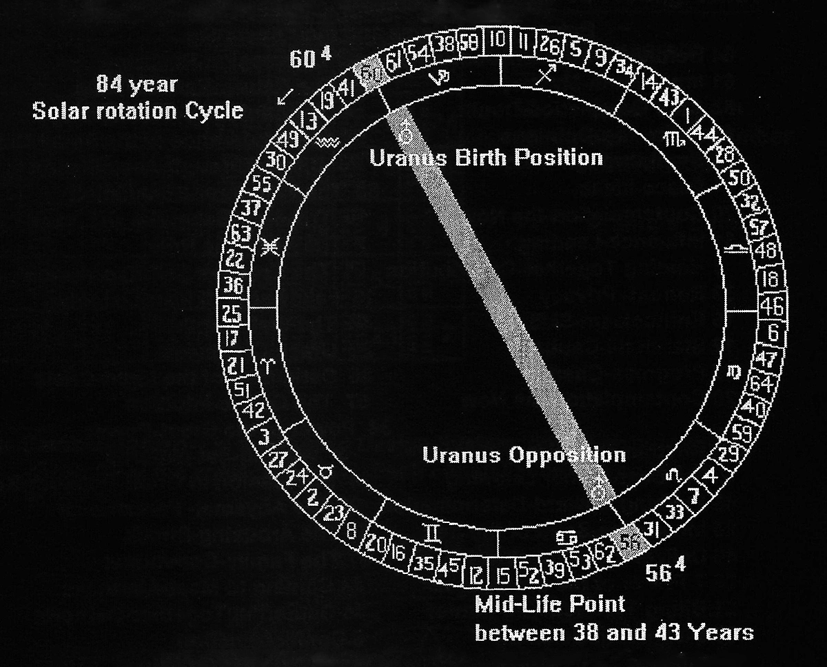 In Human Design, the human Life cycle is based on the orbit of the planet Uranus, which takes eighty-four (84) years to go around the Sun. When Uranus has moved to a position exactly opposite its original birth position, this is the mid-life point.