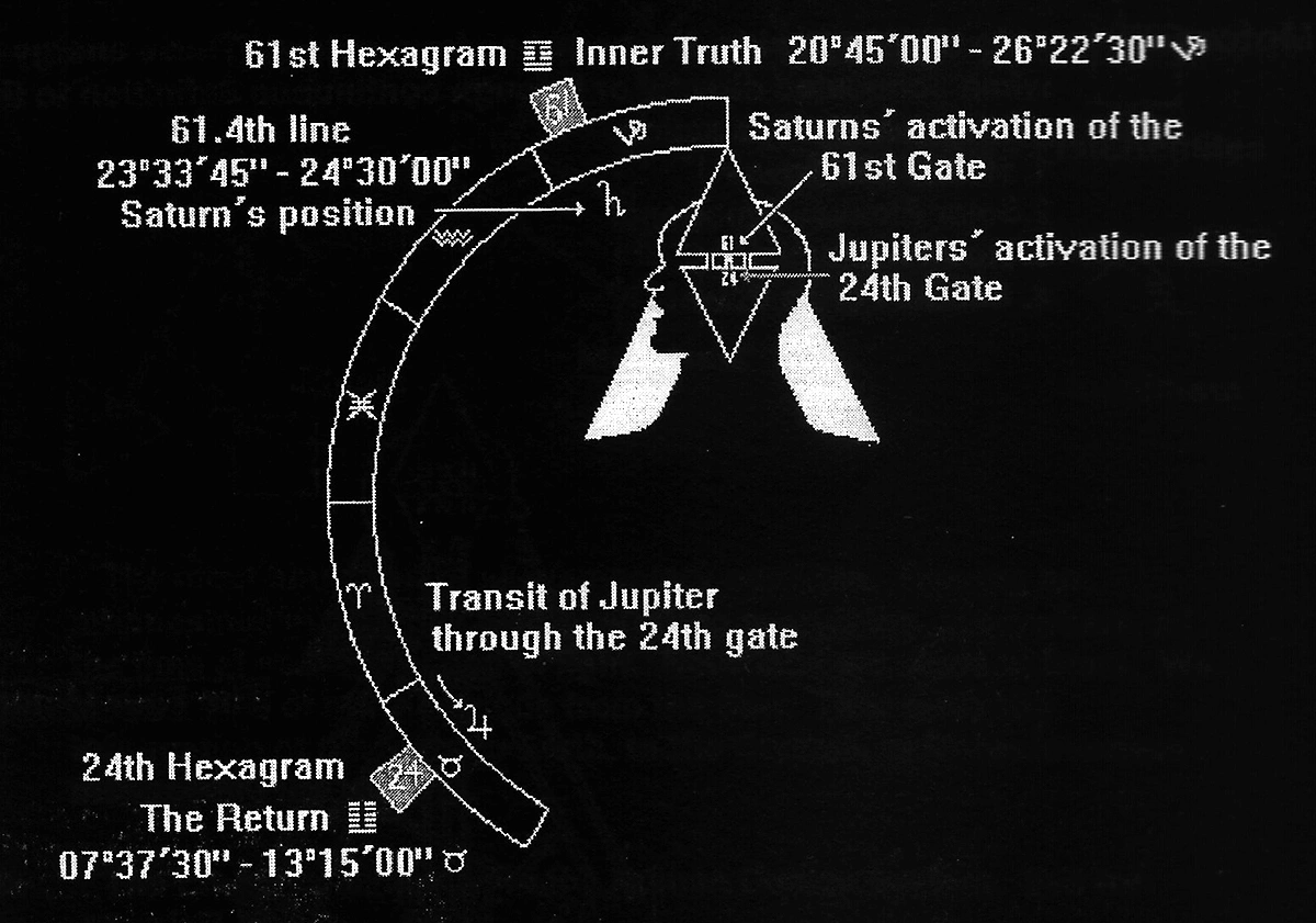 Когда любая из планет, Юпитер или Сатурн, во время транзита входит в 61-ю гексаграмму, даже если она не находится в той же линии, она все равно фиксирует природу линии. Планета может не только влиять на каждые ворота напрямую, но и воздействовать на ворота с другой стороны канала через определение. В этом примере транзит Юпитера через 24-е ворота проявит Падение 61-х ворот, 4-й линии.